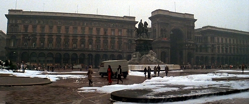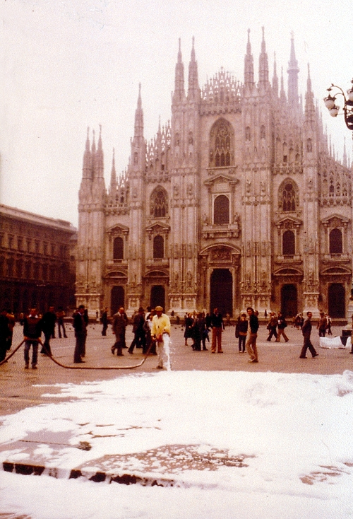 Kit West snowing up the 'Piazzo del Duomo' in front of the 'Duomo di Milano'.