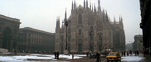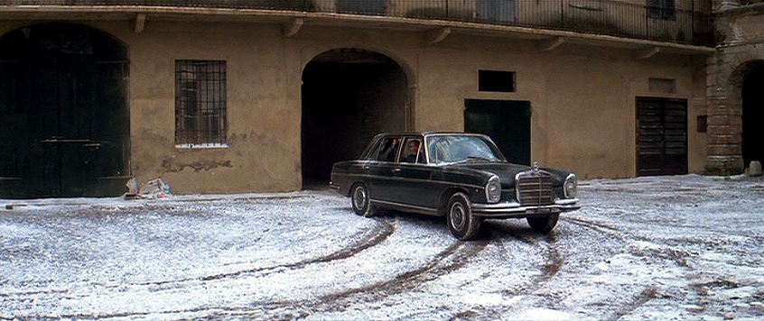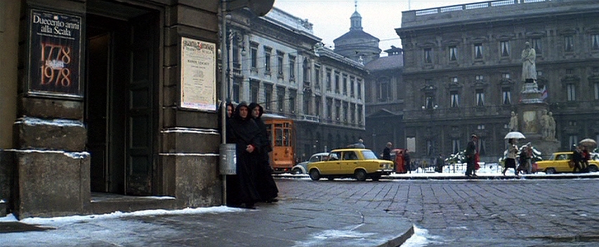 The K.G.B. (Mercedes) pursues the defector (in a Fiat) over the Cathedral Square.