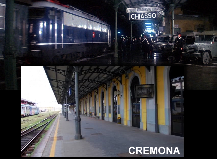 The green locomotive pushes the film set and equipment on the Po bridge of Casalmaggiore.