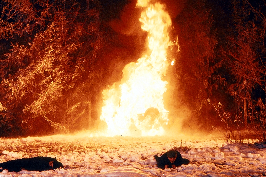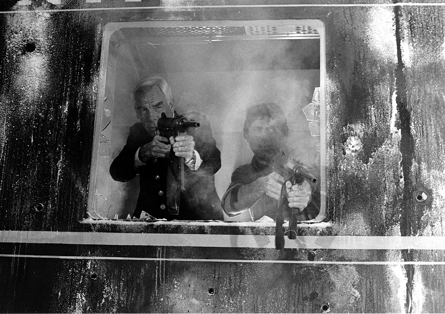 Kit West (right) in Munich station, snowing up the location with extinguishing foam.