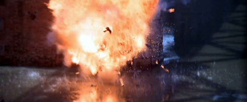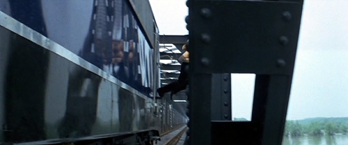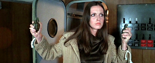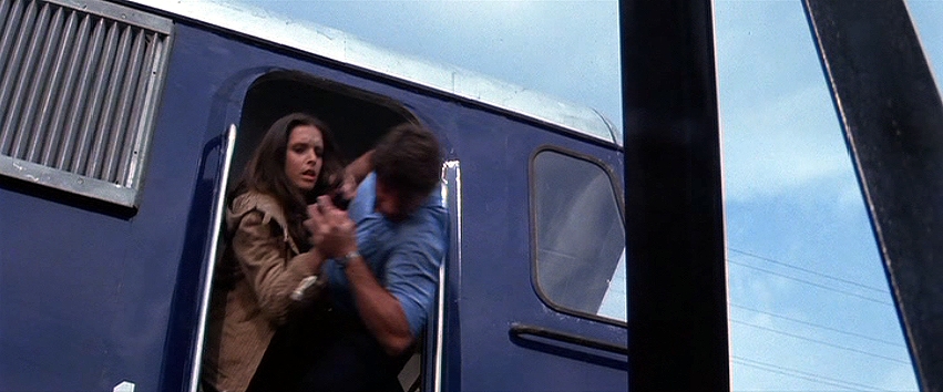 Leroy (Joe Namath) grabs Olga (Sylvia Langova) and the grenades and jumps from the train.