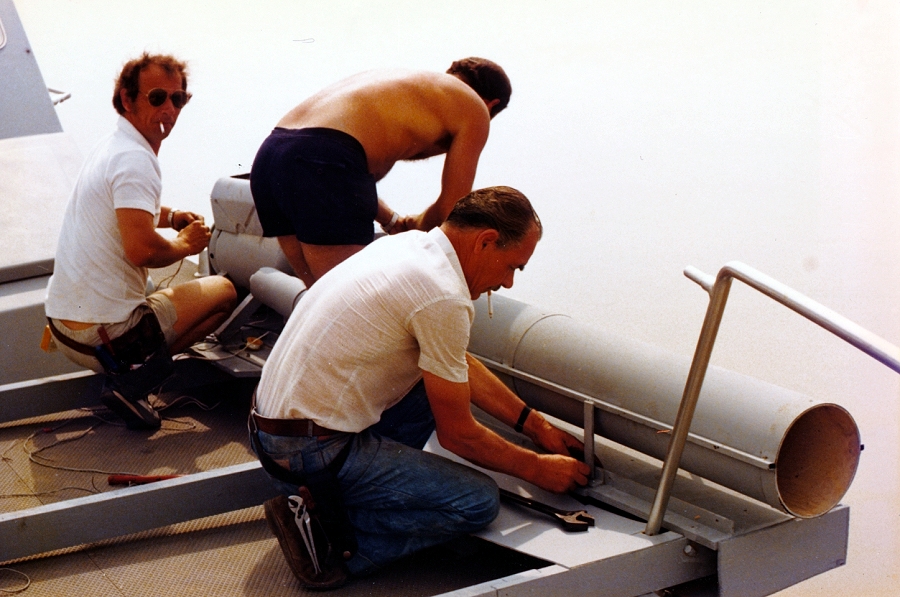 Kit West (SPFX) fixing dummy torpedo to motor launch.