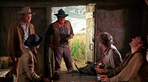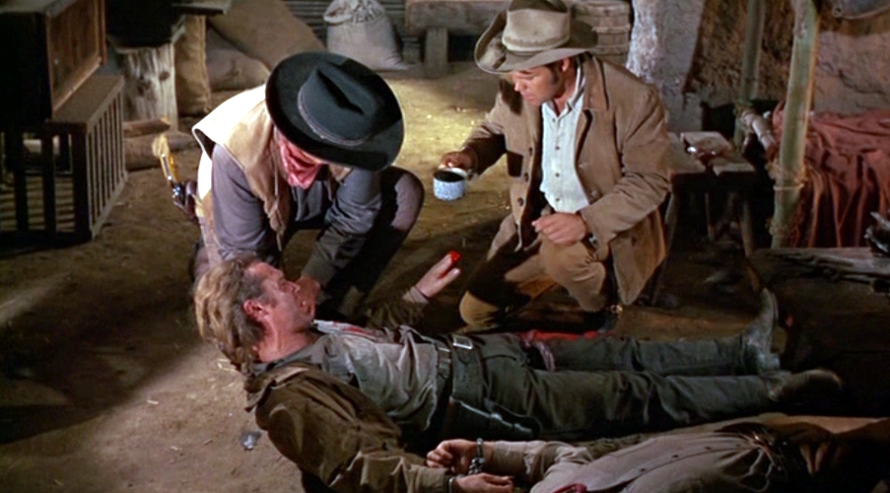 Rooster Cogburn (John Wayne) wants to get information about the Pepper Gang from Emmett Quincy (Jeremy Slate) and
