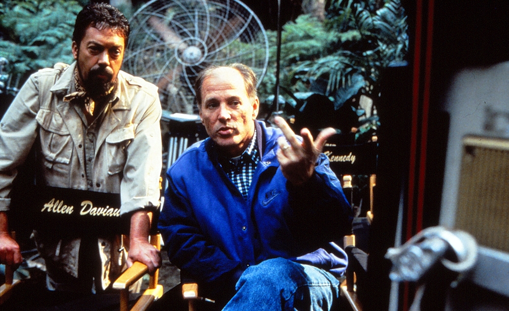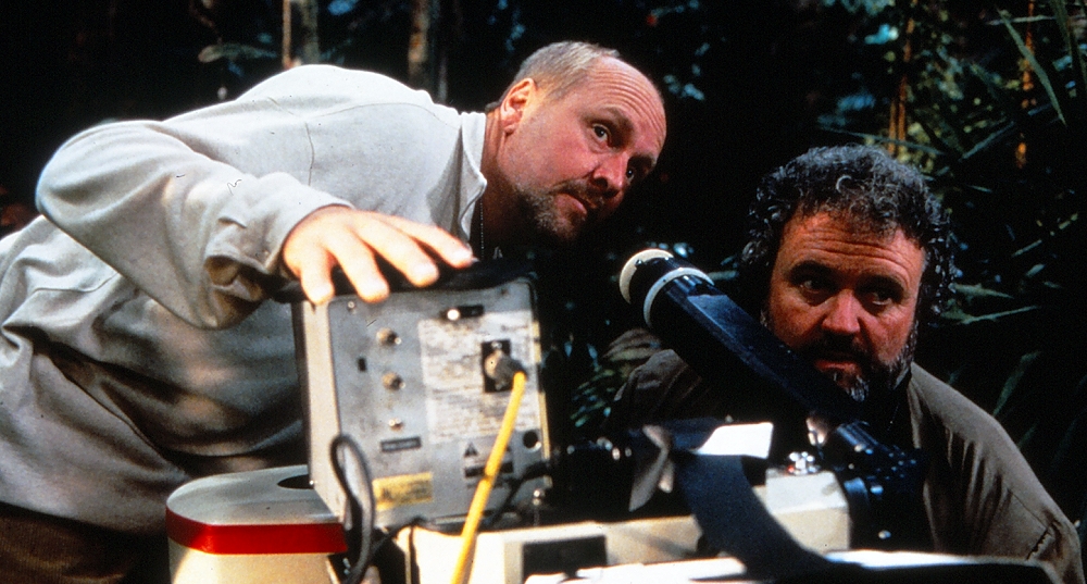 Production Designer John Michael Riva and DOP Allen Daviau setup a shot in the jungle.
