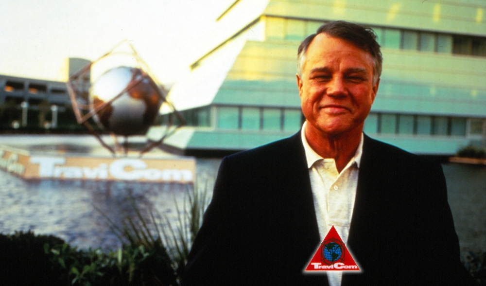 Mr.TraviCom stands in front of his futuristic TraviCom company building.