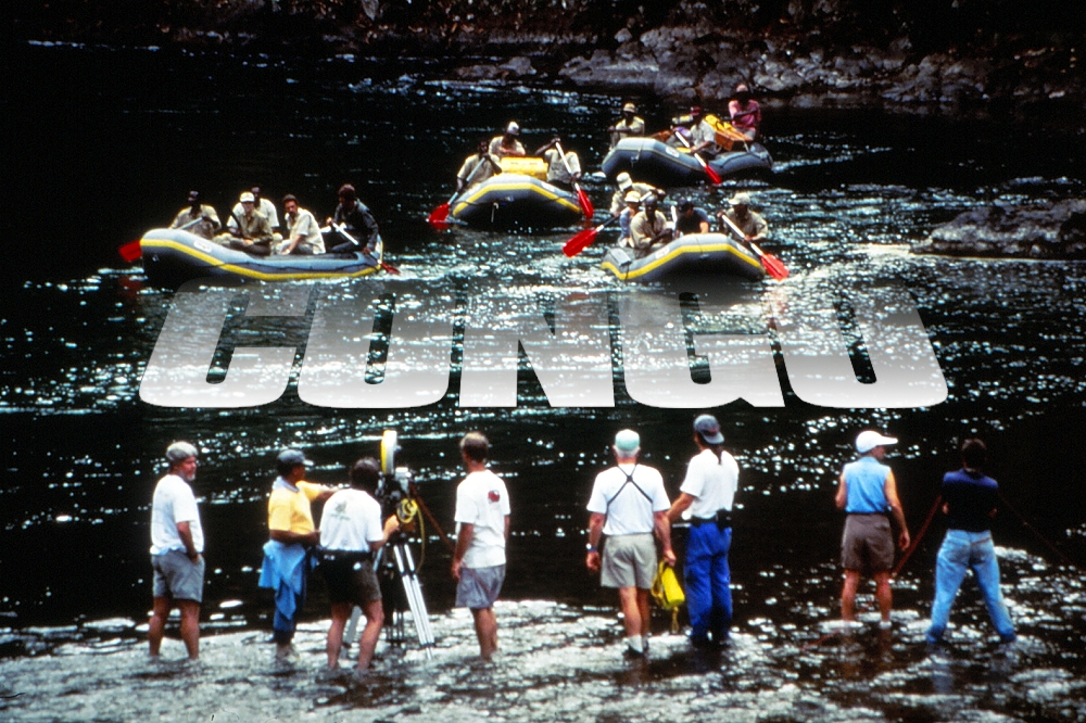 The camera crew standing in the water filming a rafting scene.